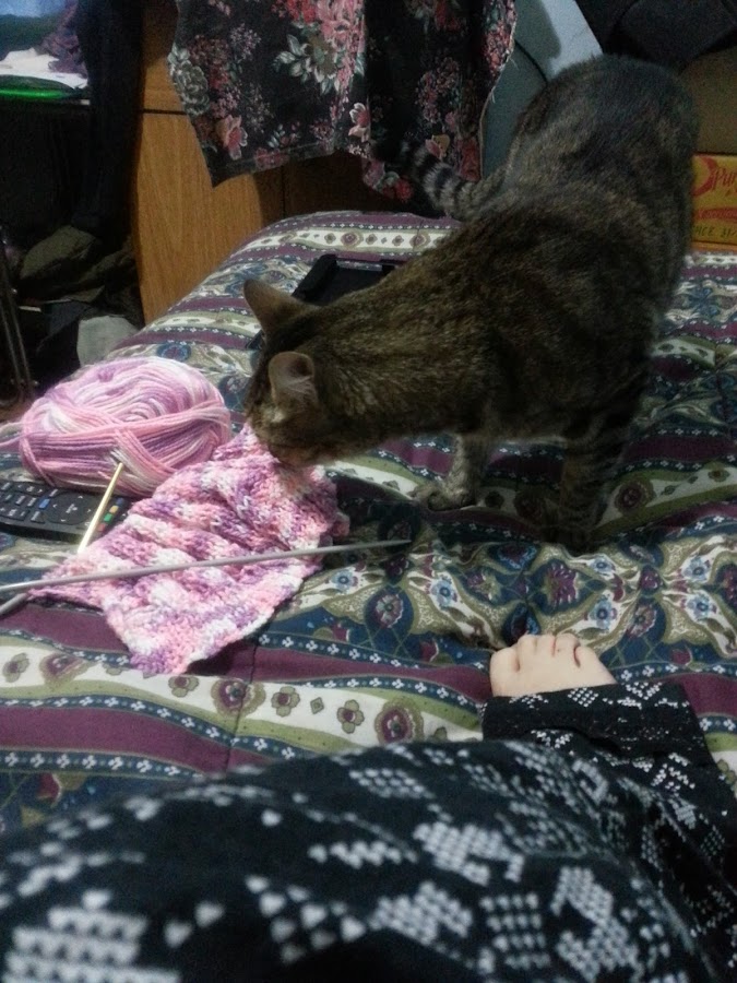 Les dejo esta foto porque me hizo tanta gracia, este es Manuel (yo le digo Manu de cariño) y estaba sentado sin moverse, cuando me detuve porque me dolían las manos, él vino a ver qué estaba haciendo. Me encantan tejer acompañada, en especial si es de Manu, él no molesta :)