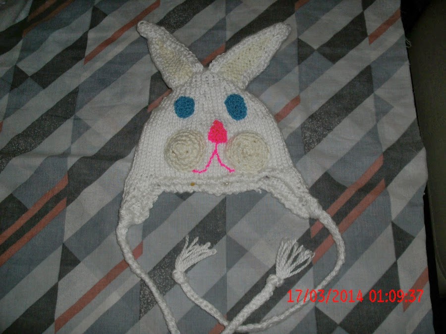 Aqui abajo esta terminado el gorrito, como yo lo queria, o sea, como lo explica Esperanza Rosa, esto quedaria con las orejas solamente y las trenzas para atar, pero yo queria hacerlo con ojos, nariz, boca y cachetes y me parecio que asi queda mas lindo. Para los ojos hice unos ovalos en crochet con lana fina en color turquesa, porque los queria de ese color, para la nariz hice un triangulito en fuccia, para que se note mas y por ultimo los cachetes los teji en un color marfil, para hacerlos teji dos circulos en medio punto y trate que quedara como un cuenco o sea que abultaran como si estubieran inflados o abultados, no les agregue ningun relleno porque si el bebe lo llega a chupar, puede salir y se ahoga. Los cachetes estan hechos con la misma lana que utilise para el centro de las orejas. En los bordes para darle mejor terminacion le teji una vuelta de punto cangrejo en crochet y los ojitos tanto como los cachetes y nariz estan tejidos en medio punto en crochet.