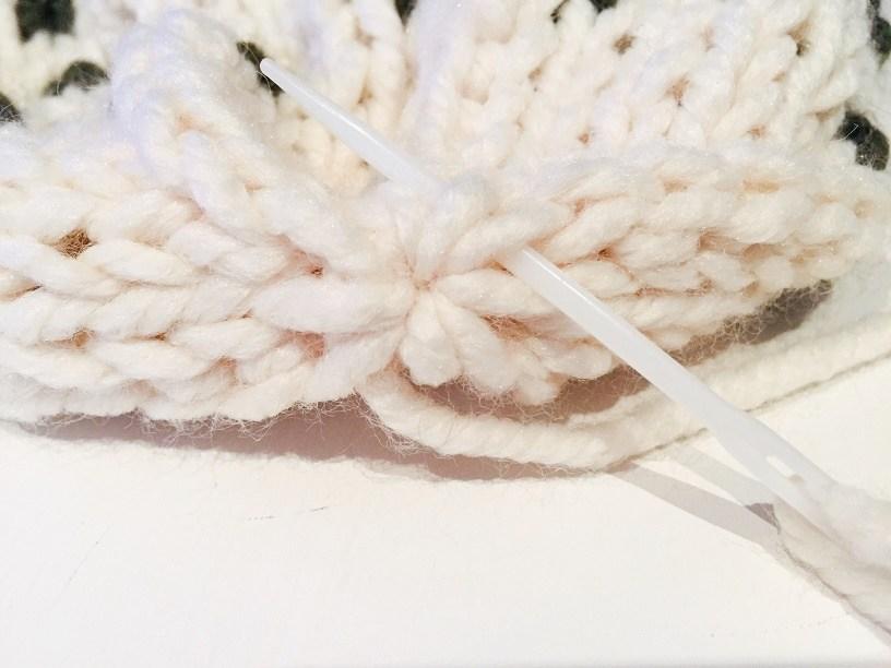 Pasada 32: recoge los 10 puntos que quedan con una aguja lanera y tira fuerte para cerrar el agujero que queda.