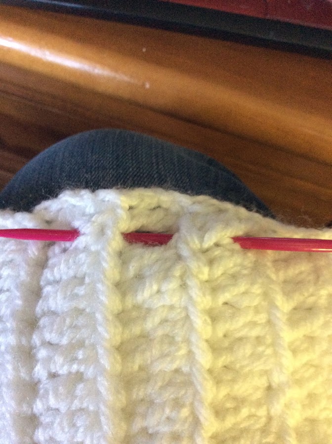 2 cadenetas y todo varetas o puntos altos como en la primera vuelta,pero esta vez pinchando sólo en la hebra de atrás, los últimos 8 puntos en punto bajo pinchando en la hebra de atrás.