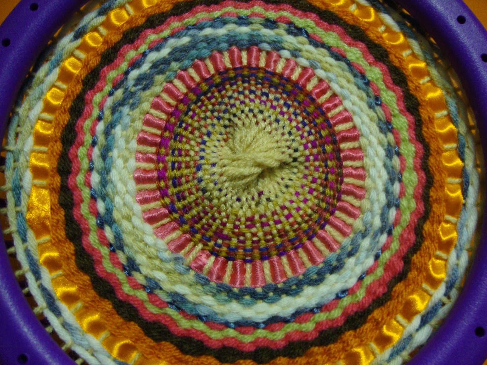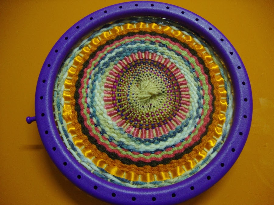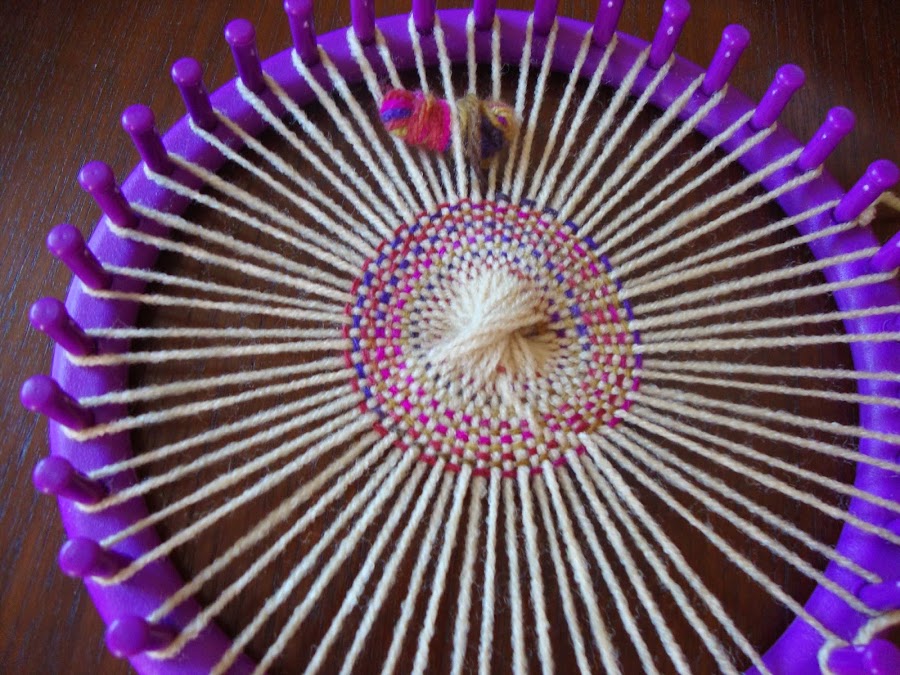 Primero se hace el círculo central y se teje como un cesto. Yo aproveché el telar circular, pero si no lo tenéis os podéis fabricar un disco de cartón con muescas todo alrededor y la utilidad va a ser la misma pues se trata de ir pasando la lana base de lado a lado creando una estrella igual que os mostré para hacer los girasoles de la bufanda en esta otra ENTRADA pero ahora lo hacemos a lo grande, sólo una vuelta completa y dejando una última hebra impar (falta en esta primera foto, la añadí luego al recordar que es necesaria para tejer en redondo como un cesto, para que al finalizar una vuelta y empezar la siguiente la hebra que primero pasaba por encima después pueda pasar por debajo y viceversa).