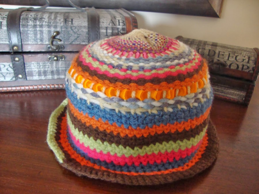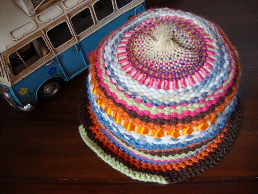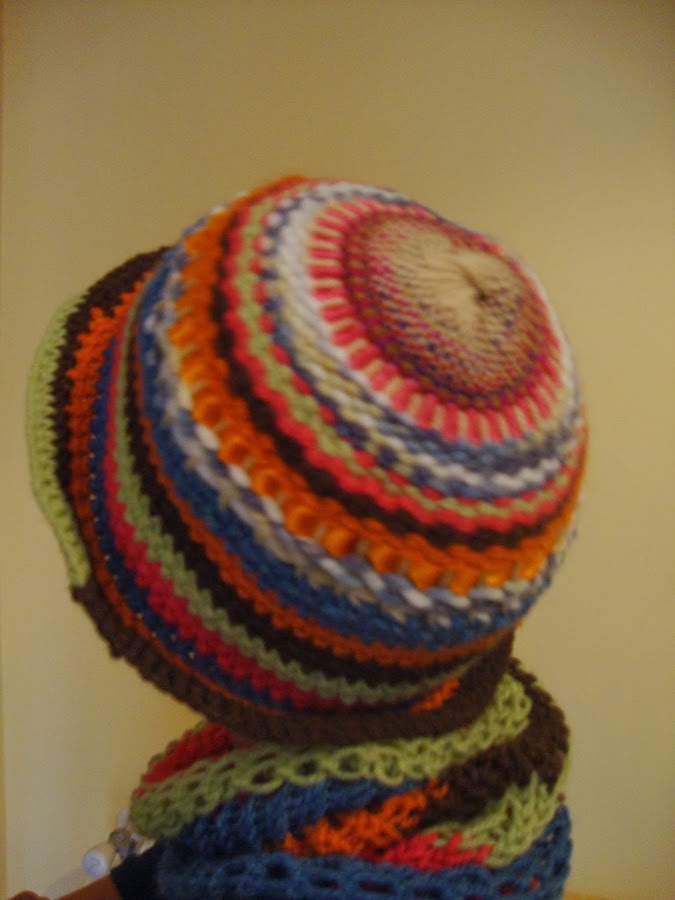 Como veis es un gorro tipo casquete muy vistoso y original. Combina diferentes lanas y cintas (con lo cual nos puede servir para aprovechar restos, incluso luce más si son de diferentes texturas, ya lo veréis).