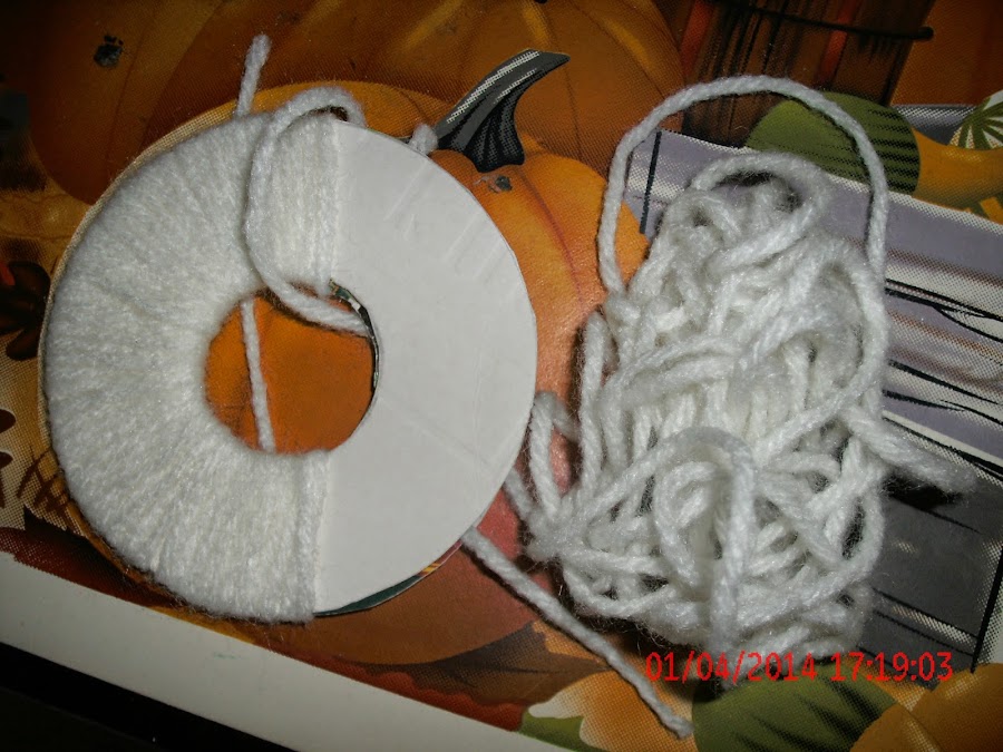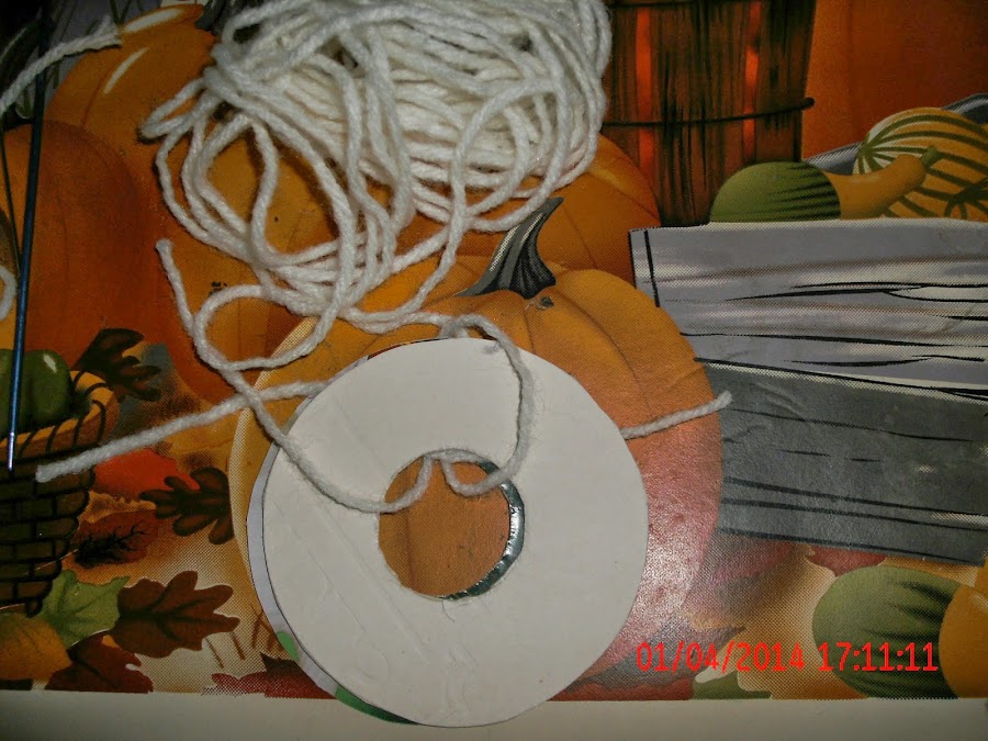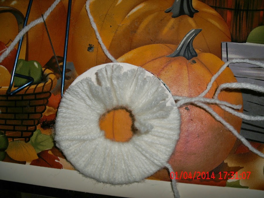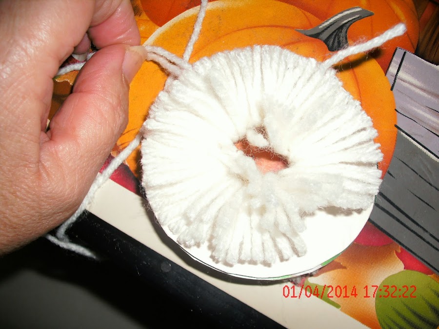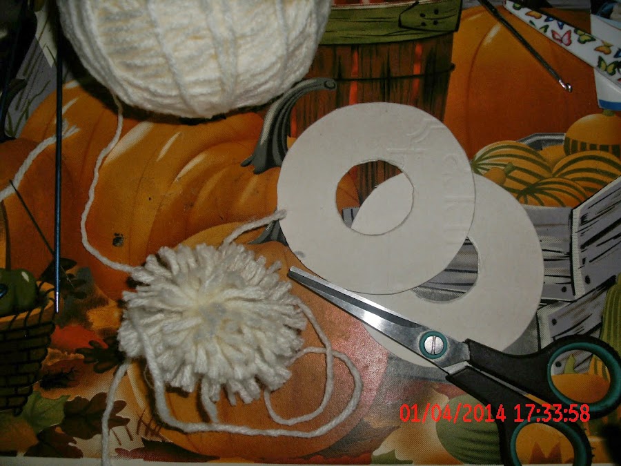 AQUI ESTOY HACIENDO EL POMPON, PARA HACERLO CORTE DOS CIRCULOS EN CARTON A LOS QUE LE SAQUE UN CIRCULO EN EL CENTRO, ESTO ES PARA PODER PASAR LA LANA, LUEGO PREPARE UN OVILLITO DE LANA DE UN TAMAÑO COMO PARA QUE PUEDA PASAR POR EL CENTRO Y EMPECE A PASARLO SOBRE LOS CARTONES, PONIENDO ESTOS JUNTOS Y POR EL MEDIO DE LOS DOS PASE UN TROZO DE LANA PARA LUEGO ATAR EL CENTRO DEL POMPON