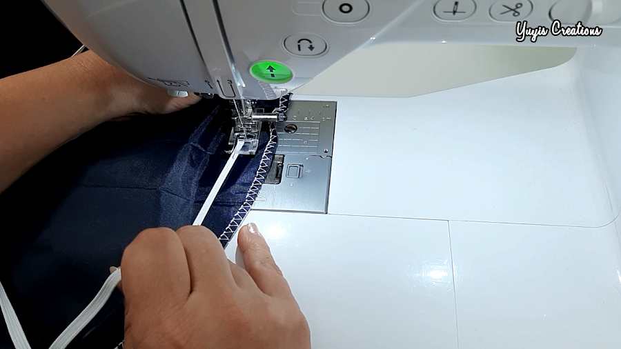 Y cosemos con puntada en zigzag empezando por una de las uniones. Al momento de coser debemos estirar la elástica por delante y por detrás de manera que la elástica llegue de una marca a otra.