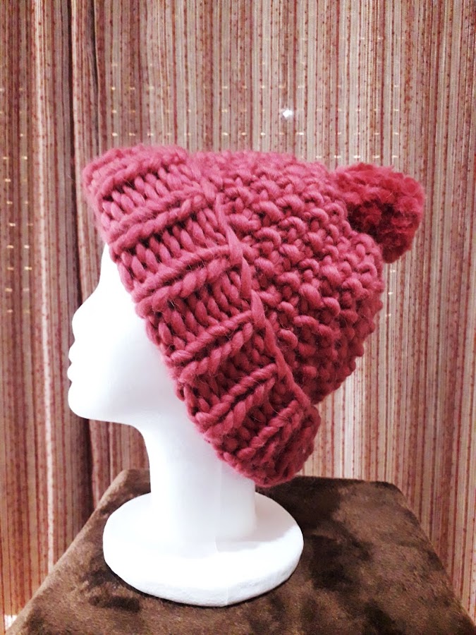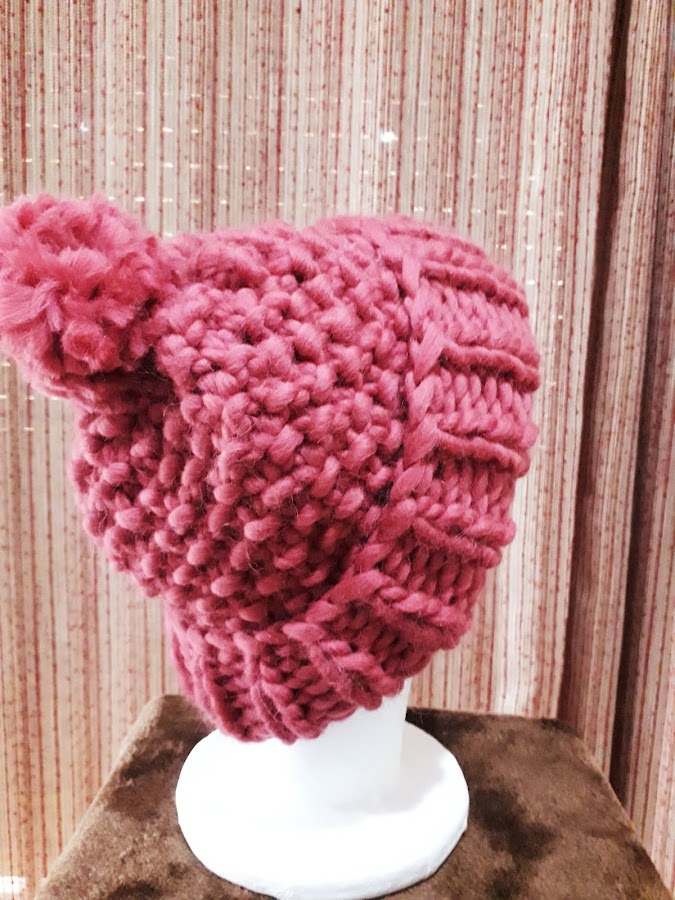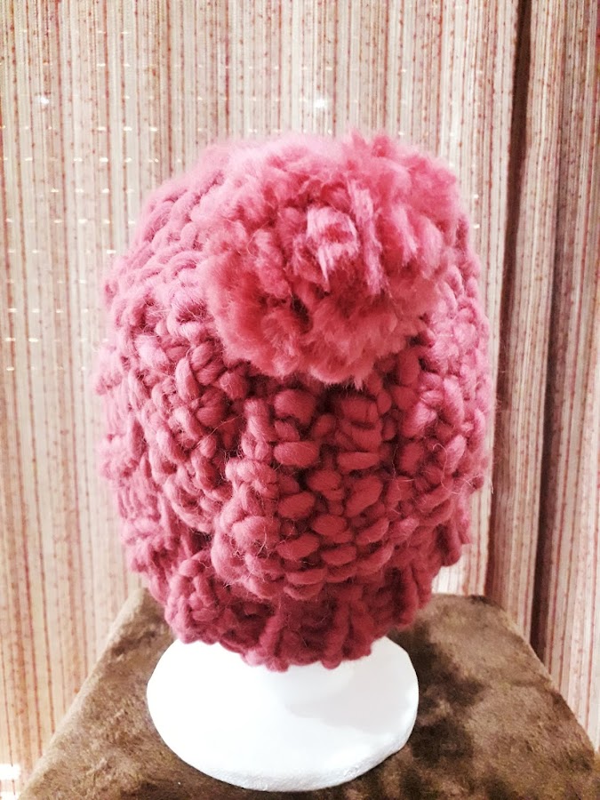 Mi gorro está compuesto por unas vueltas en punto elástico, y el resto en punto de arroz. Para decorarlo, le he puesto un pompón.