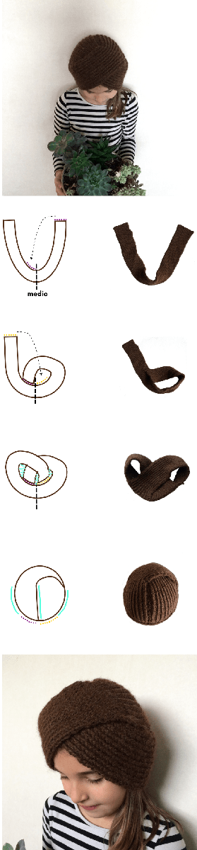 Al estar tejido en punto elástico, el gorro-turbante se adapta muchísimo. El que lleva mi hija (7 años) en la foto, es el mío… Aún así, si queréis hacerlo más grande o más pequeño únicamente tendréis que hacer la bufanda más larga. Os doy instrucciones al respeto más abajo.