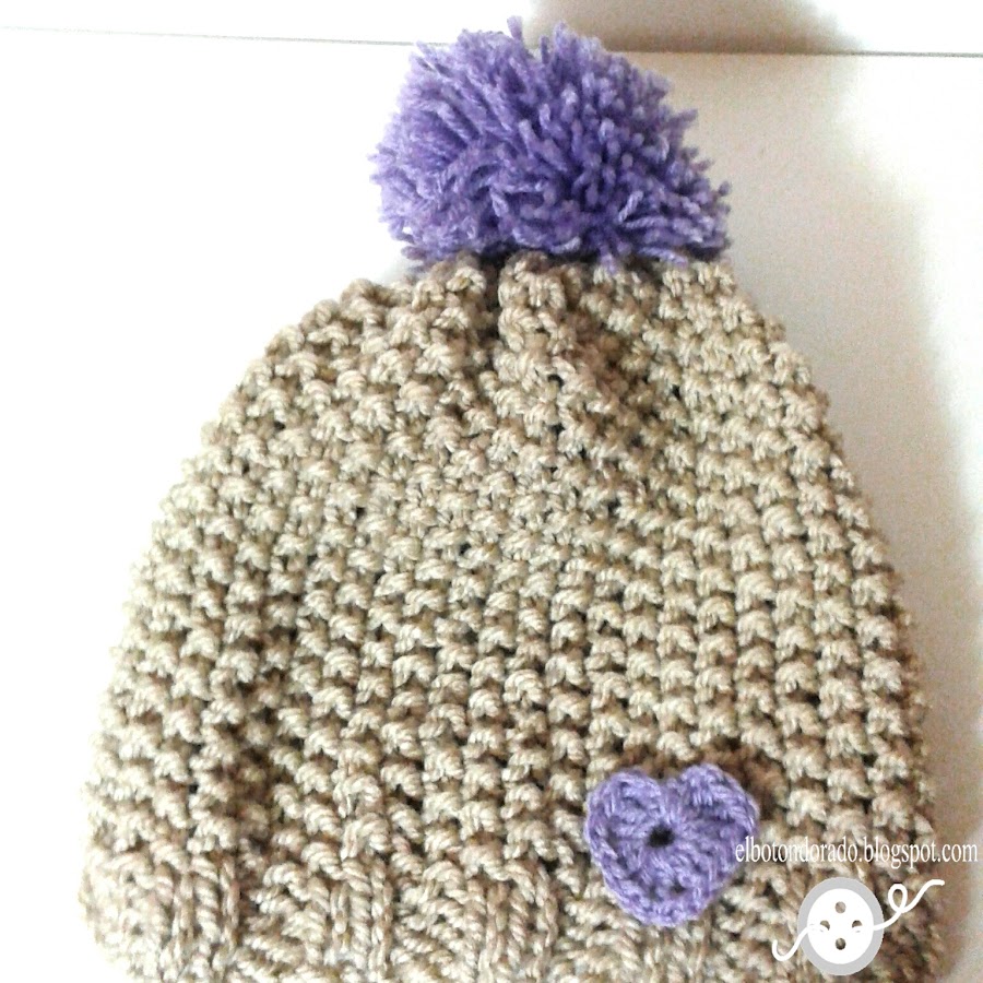 Está tejido en punto arroz y lo adorné con un corazón que hice a ganchillo, a juego con el pompón.