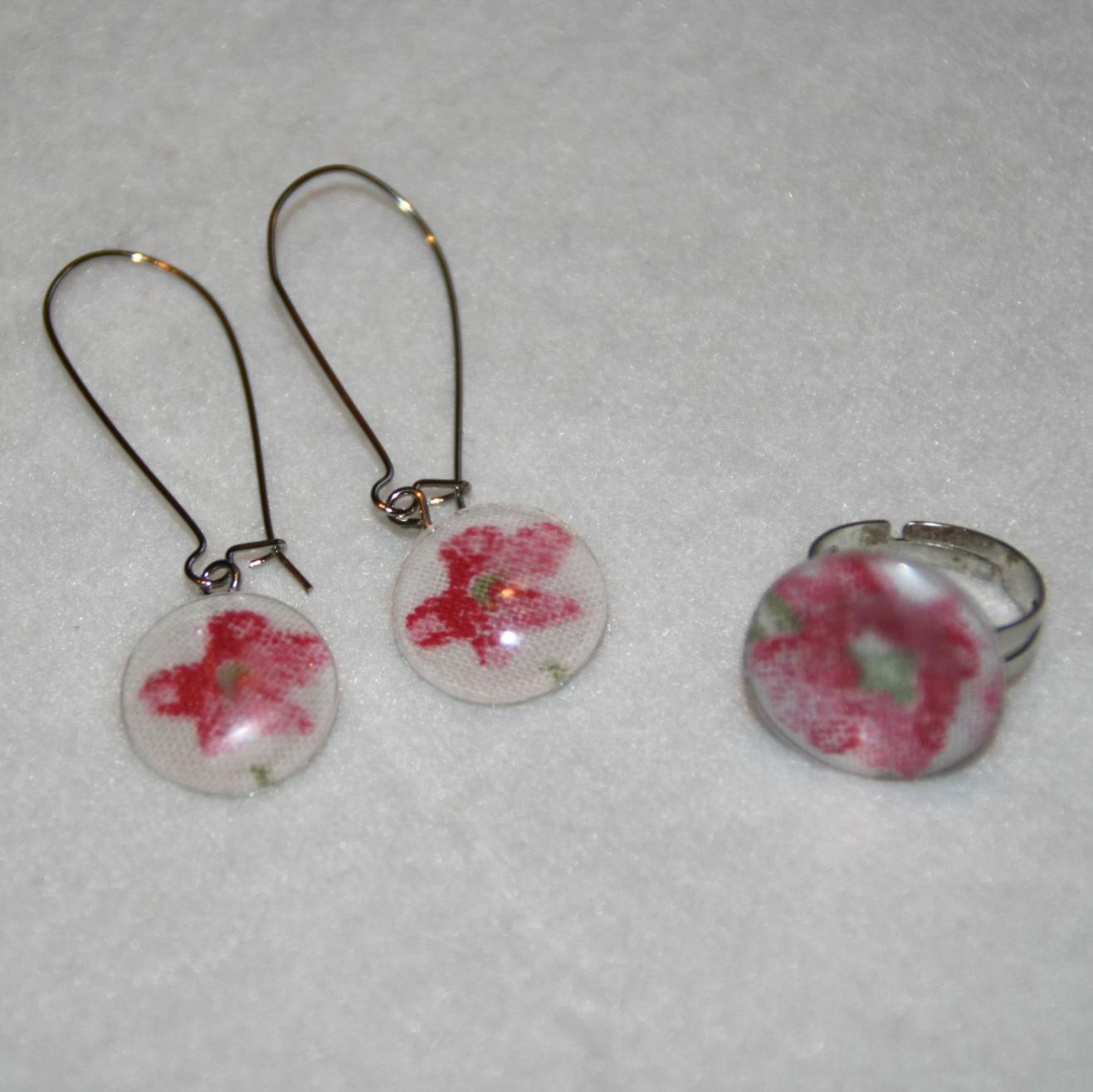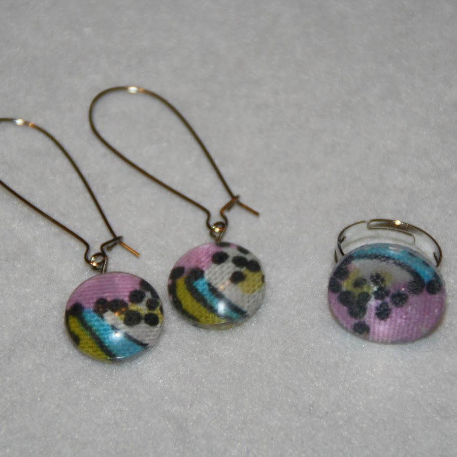 Y de pronto, el otro día se me ocurrió qué uso iba a darles. Decidí que con las más pequeñas haría pendientes y con las más grandes, anillos. Y esto es lo que me salió: 4 conjuntos de pendientes y anillos que decoré con retales de telas que tenía de unas muestras que solicité hace algún tiempo