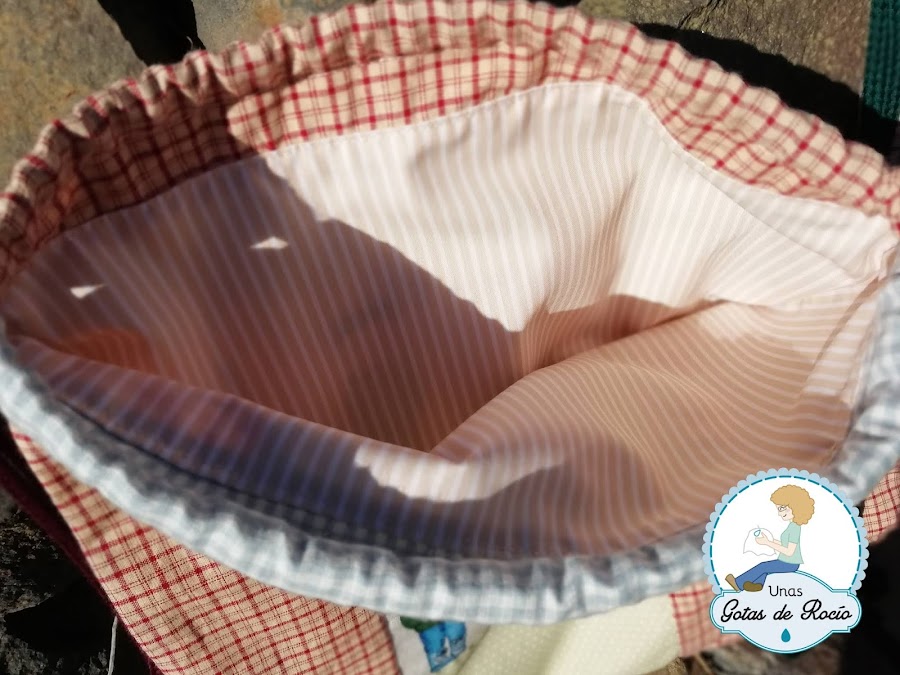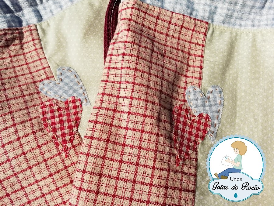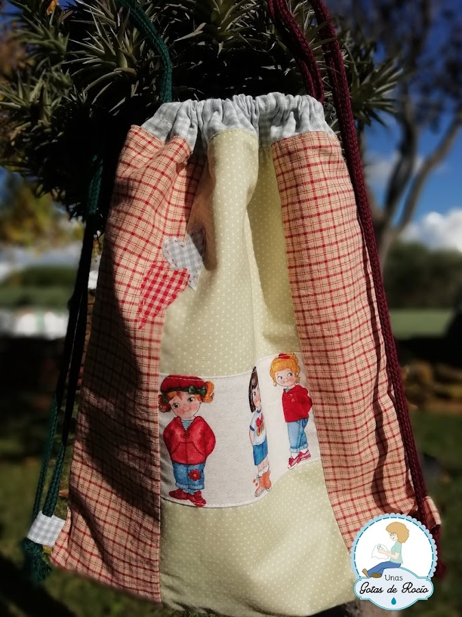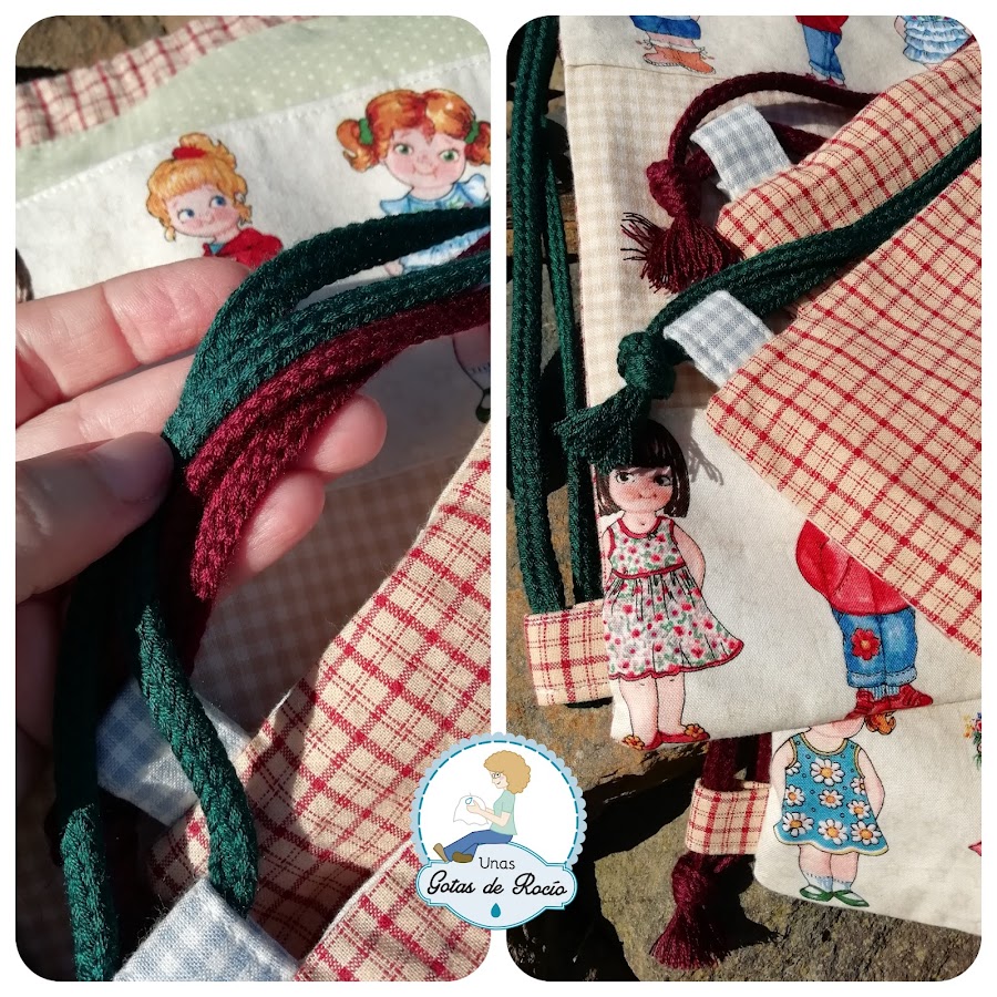 He combinado varias telas, todas en tonos naturales, dando relevancia a la tela de muñequitas que tanto nos gustó y gusta a todas.