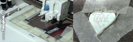 Para sujetar muy bien la pieza, yo os sugiero que coloquéis un cartón algo consistente sobre la manta de corte de la Curio y recortéis en ese cartón la forma de la placa que vais a grabar.