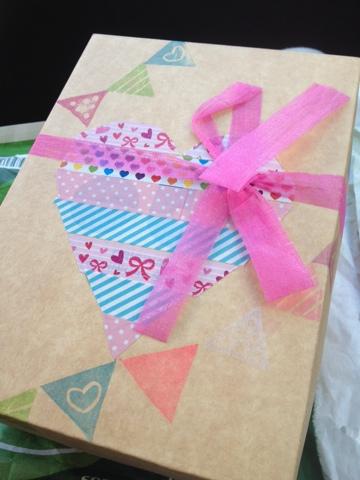 Al quitar el periódico una cajita de cartón diseñada por ella con más sellos y un corazón de washi.