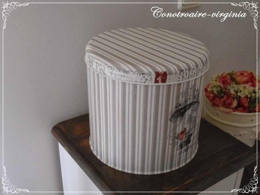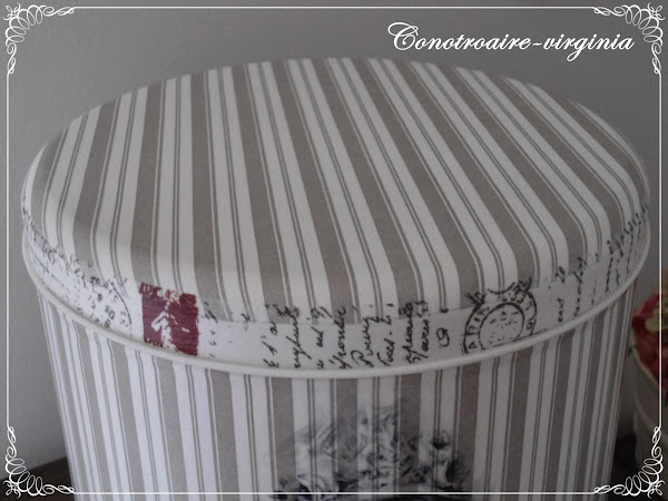 Luego la he forrado totalmente con esta servilleta de rallitas. En la tapa, para rematar, he puesto washi tape con motivo de escritura antigua.