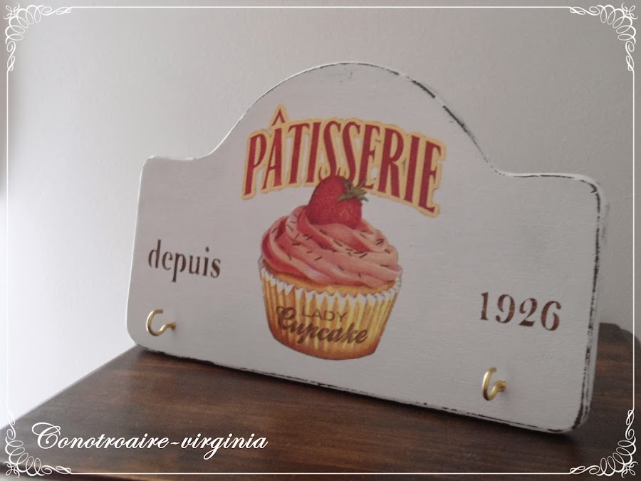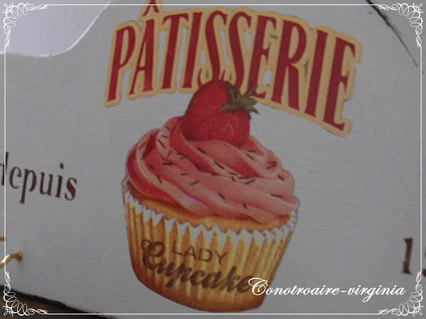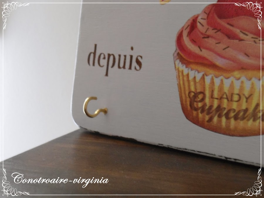 El motivo del pastelito es un recorte de servilleta, y las letras laterales las he hecho con stencil.