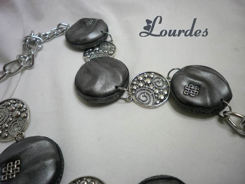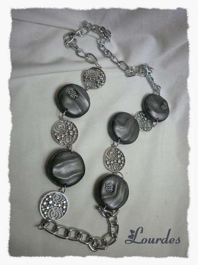 Collar largo con piezas realizadas en arcilla polimérica de diferentes tonos de gris plateado.El brillo de las piezas es a base de lijado y pulido lo que le da un aspecto más natural.Adornos metálicos y cadena plateadas.