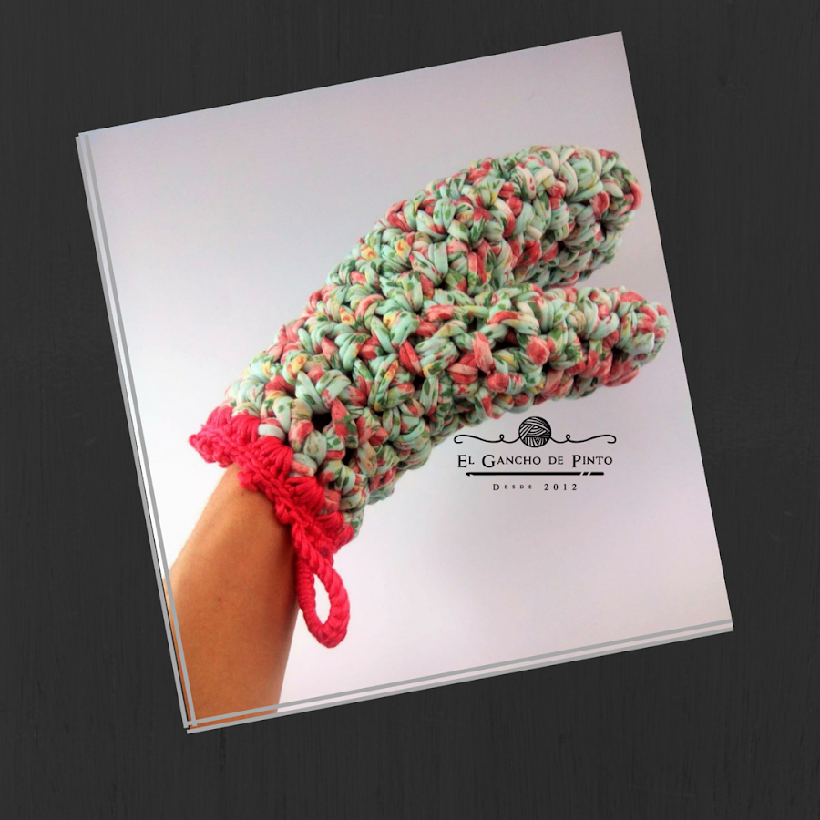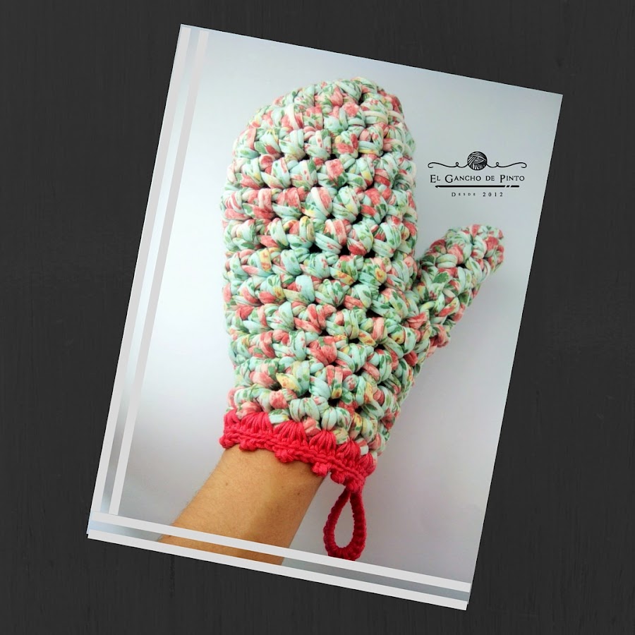 Con un hilo de algodón que haga resaltar nuestro trapillo estampado le hacemos un remate. En cada punto de la vuelta anterior haremos 4 pb repitiendo en toda la vuelta, excepto donde queramos hacer la anilla de nuestro guante, para lo cual haremos 19 pc, y seguiremos con la secuencia de 4 pb.terminar con un pr.
