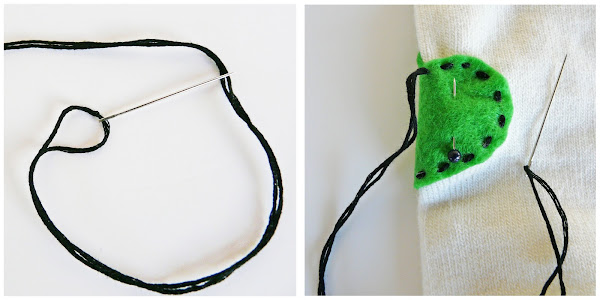 5. Vamos a hacer puntos súper sencillos: en línea. Y el primero será por el interior del guante para que no se vea el extremo de los hilos. Sólo tienes que ir cosiendo por el borde del corazón como en la imagen: