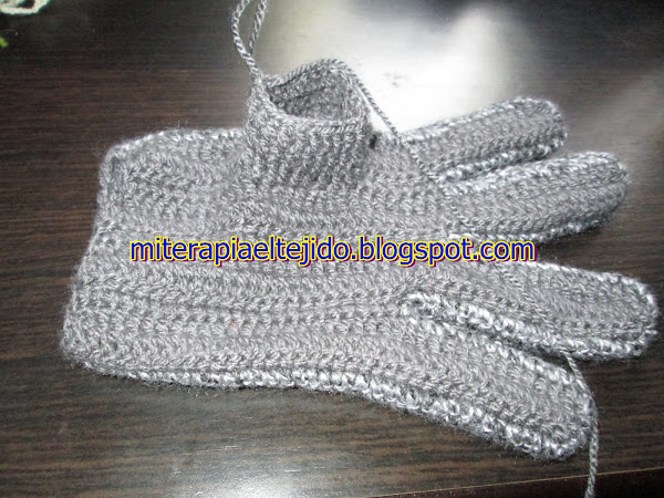 En el rectángulo u orificio que nos quedo realizaremos el dedo gordo, tejeremos en forma circular.