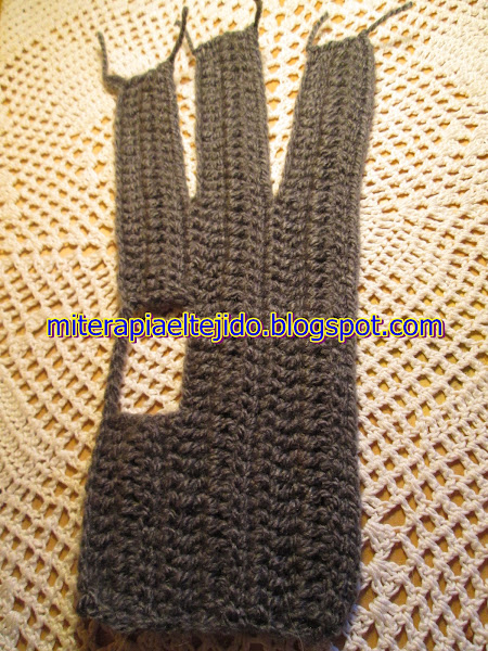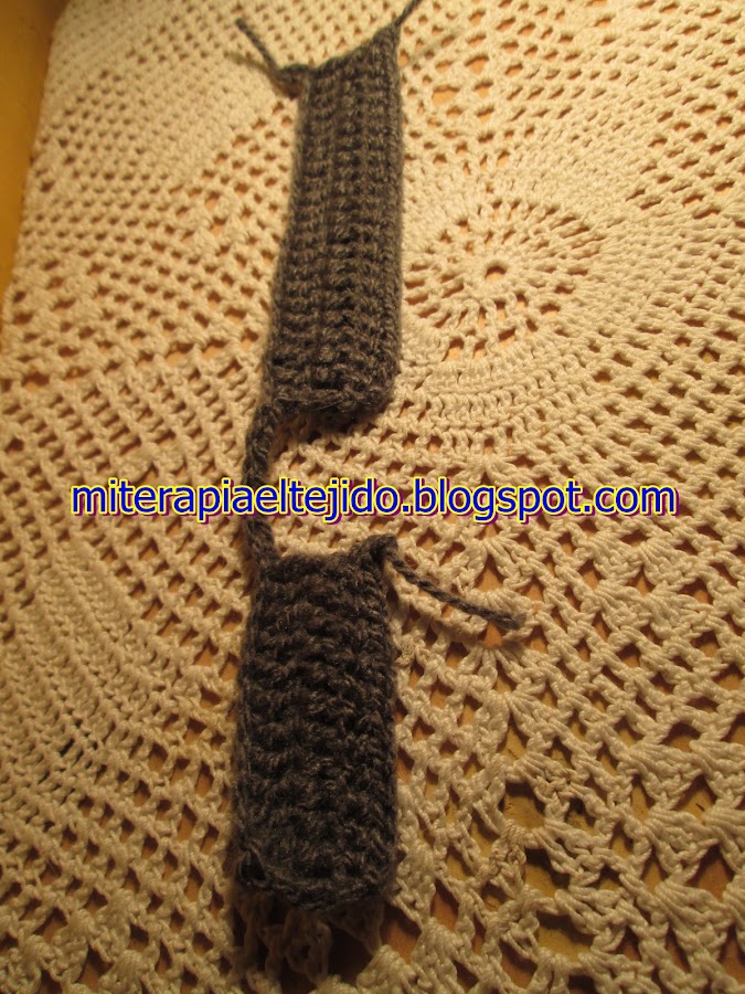 ahora tejeremos todo el contorno de esta parte con medios puntos menos el puño, yo lo hice con una lana de diferente color.