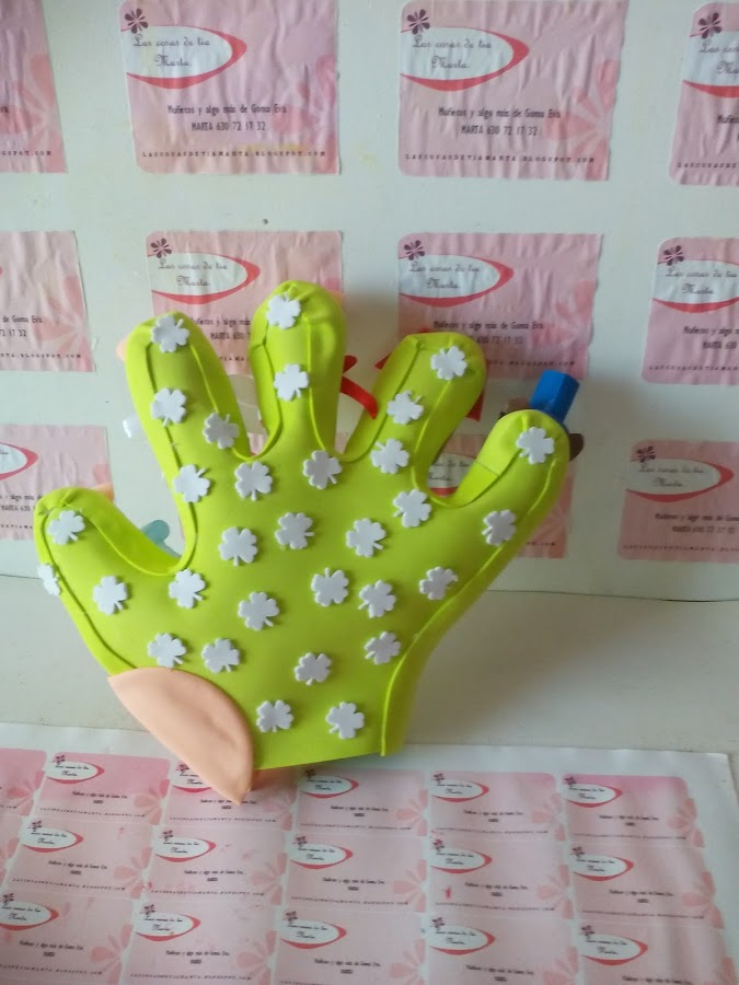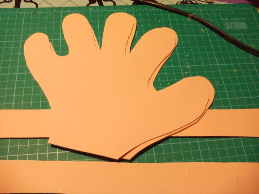 1. Marcamos un guante sobre goma Eva, cortamos doble y unimos con una tira de 3cm de ancho.