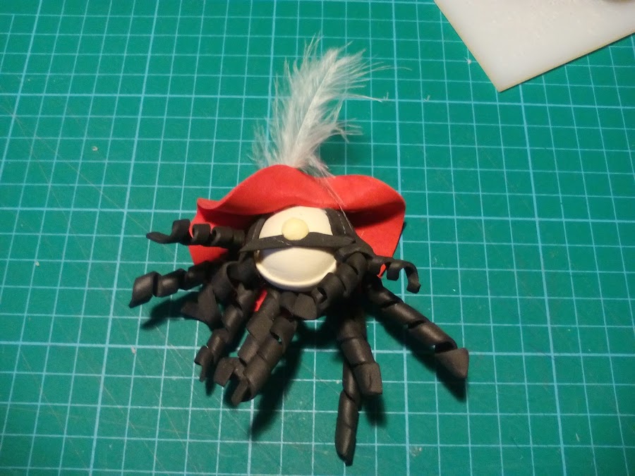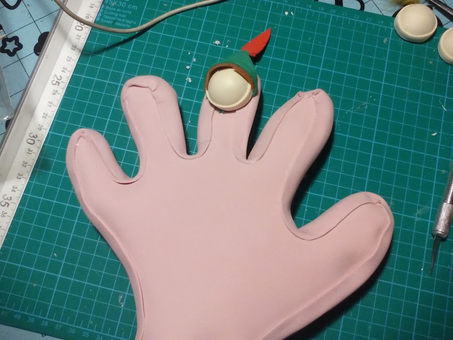 8. Pegamos en un dedo del guante y para dar más "juego" a la hora de ponerse el guante hacemos un pequeño corte en el lateral y simulamos el brazo del capitán.