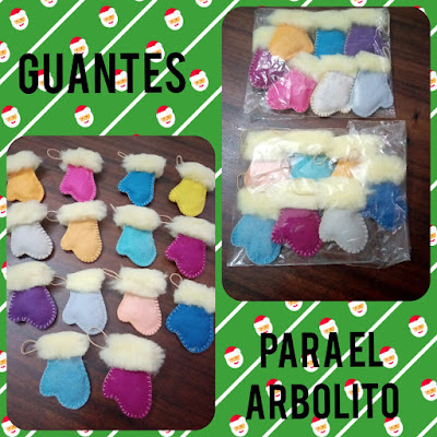 Pequeños guantes de santa en colores diversos con peluche en la muñeca para colgar en el árbol de navidad.