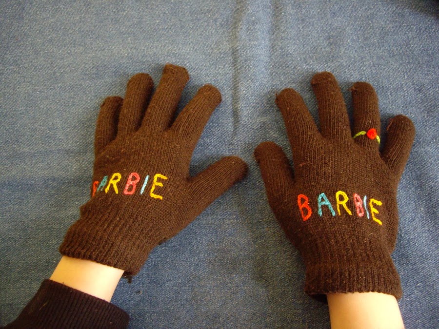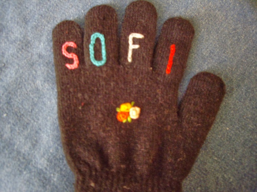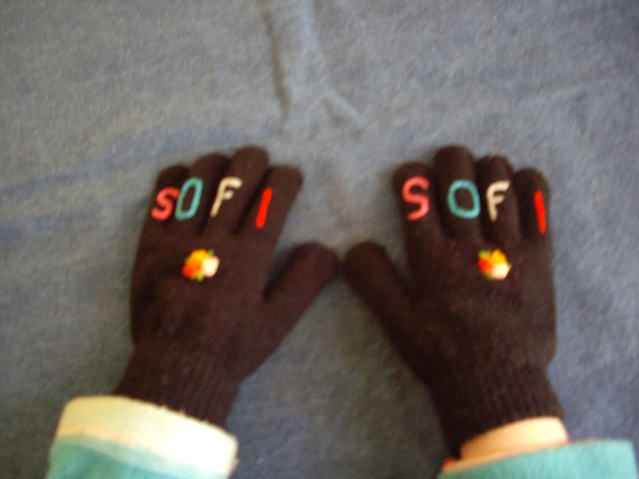 Un poco cansada de que mis hijas perdieran los guantes en la escuela, ya que todas las nenas llevan siempre los mismos colores: rosa o violeta. Decidí que ellas llevarían unos distintos. Tenia un par de guantes marrón y otros negros, pero el problema es que no son colores que les agraden a las nenas usar, así que había que hacerlos un poco mas atractivos. Puse manos a la obra, y aprovechando la tormenta de nieve se me ocurrió bordarles con punto cadena el nombre a cada una, usando distintos colores de hilo.