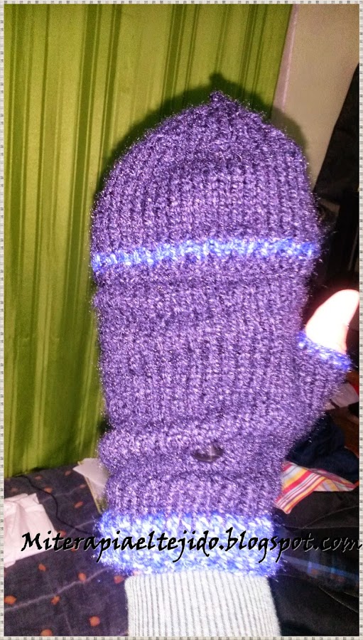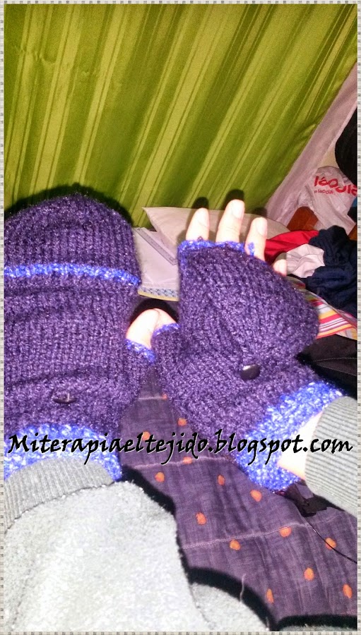 los he tejido a palillos (dos agujas) y como son los primeros que hago, me habían quedado con el puño muy corto, así que los alargue con puntos altos tejido a crochet además le tejí con medios pontos los bordes de los dedos. Digo que son especiales, ya que son sin dedos con una especie de manopla que cubre los dedos, Ahora que todos andamos con el celular para todos lados vienen bien estos guantes, para poder teclear bueno eso jajaja creo que ya no se usa teclear si todo es touch.Bueno aquí les dejo, para que las vean y me comenten que tal les parecen.