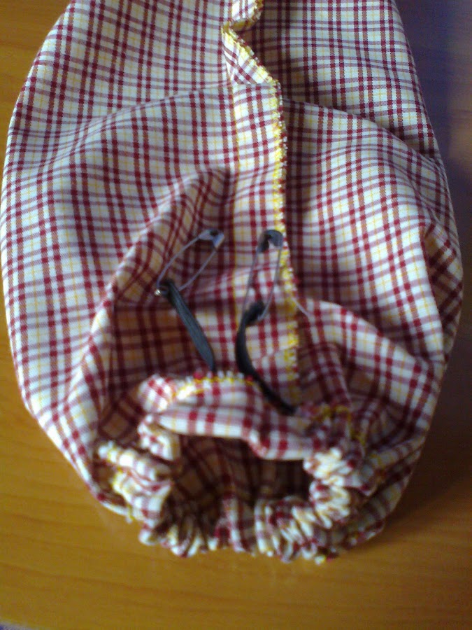 Después hacemos una pequeña doblez en el bajo y cosemos dejando un trocito de unos 2cm sin coser y por ahí introducimos la goma elástica con ayuda de unos imperdibles. Cosemos la goma viendo que apertura queremos dejarle al agujerito y cosemos los extremos de la goma, y rematamos esos cm que dejamos antes sin coser para introducir la goma.