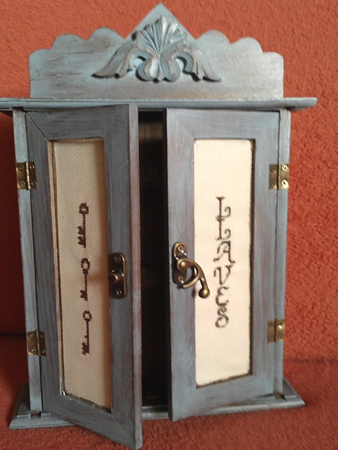 Primero he dado una patina de color marrón y oro mezclado en todo el trabajo.Cuando estaba listo y seco he mezclado blanco y azul para conseguir este tono tan delicado , antes de ponerlo , he rasgado con una vela por algunos sitios , sobre todo por los puntos mas puntiagudos y salientes y después he dado una pasada con una esponja el color azul solo pasadas de tal manera que arrastre el color. Una vez seco puse el barniz mate. Olvidé deciros que los dibujitos que hice dentro es un trevol, como plantilla hice un recorte en un trozo de papel que luego fui esponjando en cada lugar con pintura .