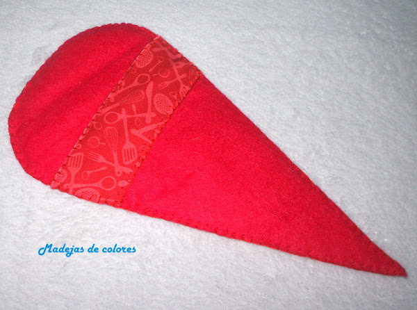 Y para terminar, una funda para tijeras de cocina, bien alegre en fieltro y tela roja con cubiertos como estampado. En el interior le puse un cartón rígido para que mantenga la forma con el peso.