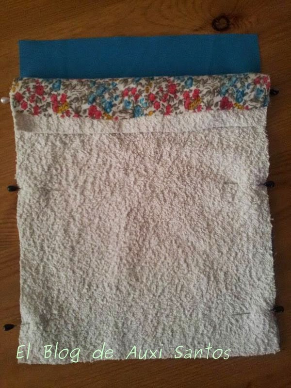 Dos piezas de tela que contrasten de 18x24 cm. y de la misma medida un trozo guata (yo he usado una tela de toalla).