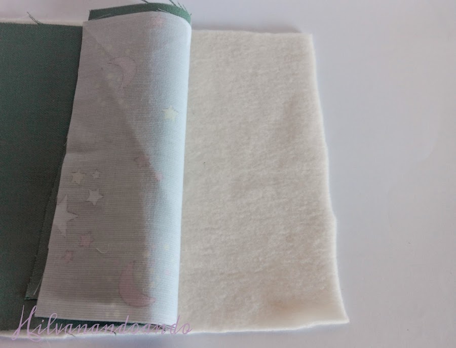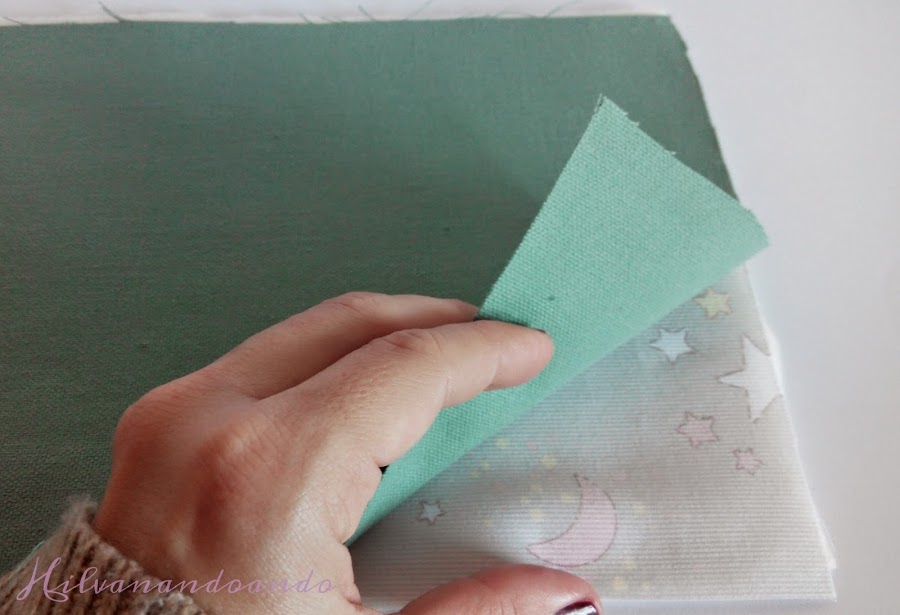Une las dos telas por su derecho, es decir junta las caras bonitas de las telas y la boata debajo.