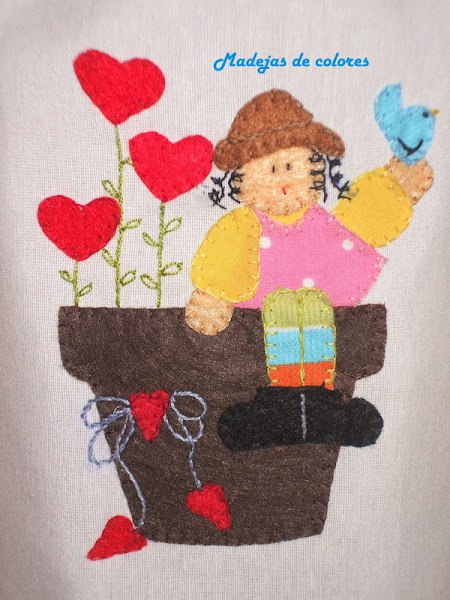 Combiné telas y fieltro. Está llena de corazones, como los que van en la maceta haciendo de flores y otros adornando el lazo, un pajarito en la mano. Para las medias encontré ideal un retal del bolso de verano, lo pueden ver aquí, por sus listas de colores, que destaca sobre la maceta de marrón oscuro y las botas negras. También encontré gracioso los rizos que salen del sombrero.
