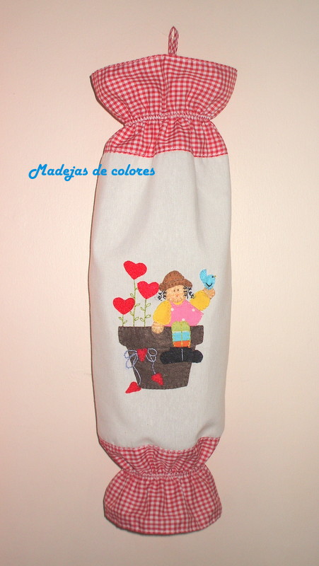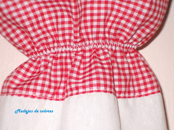 En los extremos de la bolsa puse tela de cuadritos rojo y le cosí elástico para fruncir. Dudé si bordarle "Bolsas", pero lo descarté ya lleva demasiado color.