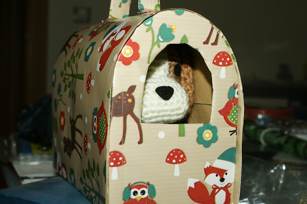 Y por último, en su transportín!! ;) A este pequeñuelo lo traje al mundo especialmente para hacer un regalo... así que se me ocurrió que la mejor forma de entregarlo era en un pequeño transportín hecho especialmente para él :) Así que cogí un poco de cartón, papel de regalo y pegamento... me puse manos a la obra, y este fue el resultado!!! No es collejísima??