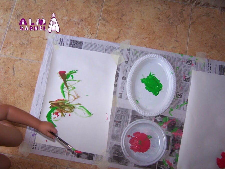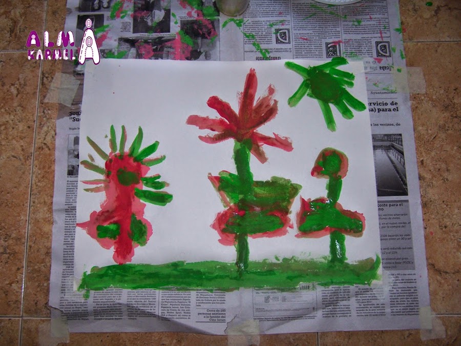 Esta vez nos pusimo a pintar en el suelo, unos papeles de periódico para taparlo un poco y listo. Al terminar se recoge y si se ha manchado algo el suelo (que siempre ocurre...) pues un fregadito y apañado ;)