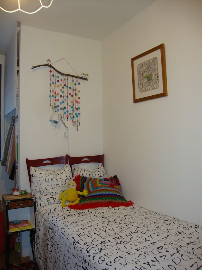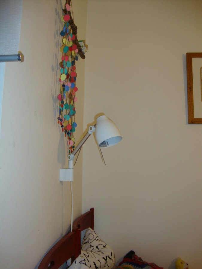 Y un día pensando en como decorar la pared del cabecero de una de las habitaciones de casa, de una manera económica se me ocurrió hacer guirnaldas con esos círculos...............y viendo un palo que tenía por casa se me ocurrió hacer pequeñas guirnaldas formando una especie de cortina.