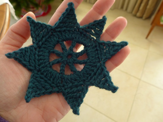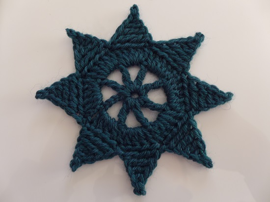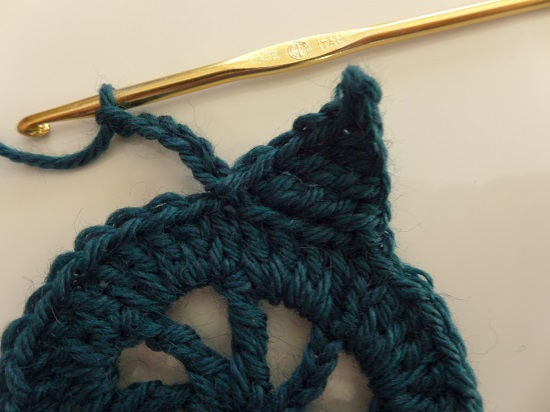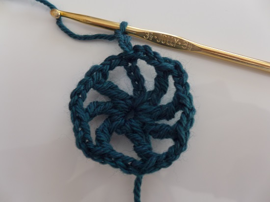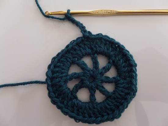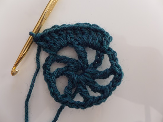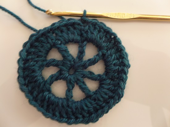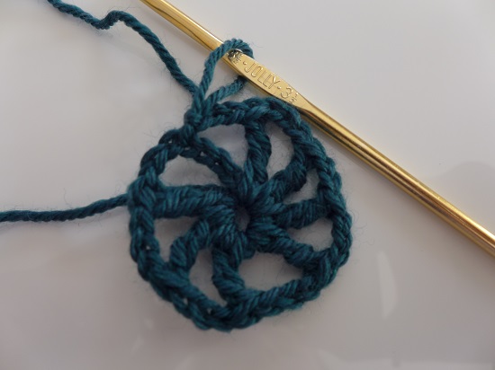 tejer 3 cadenetas y otro punto alto doble, y repetir hasta que tengamos 8 puntos altos dobles en total. Al final de la vuelta tejer 3 cadenetas y unirlas a la cuarta cadeneta del las 7 con las que comenzamos esta vuelta