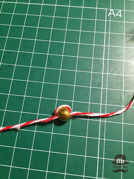 Y ensartamos la grulla atravesándola con el cordel. De esta manera la grulla quedará fijada y apoyada sobre la cuenta.