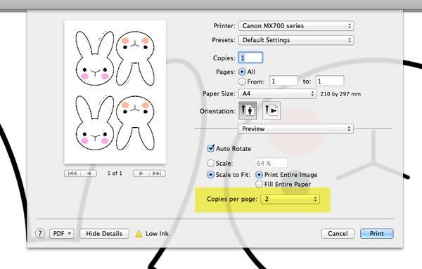 Imprimir la plantilla (2 conejos) al 50% de su tamaño, o hacer dos copias en la misma hoja (Ver imagen). Si prefieres los conejos más grandes, puedes dejarlos como están e imprimir una hoja al 100% de su tamaño.