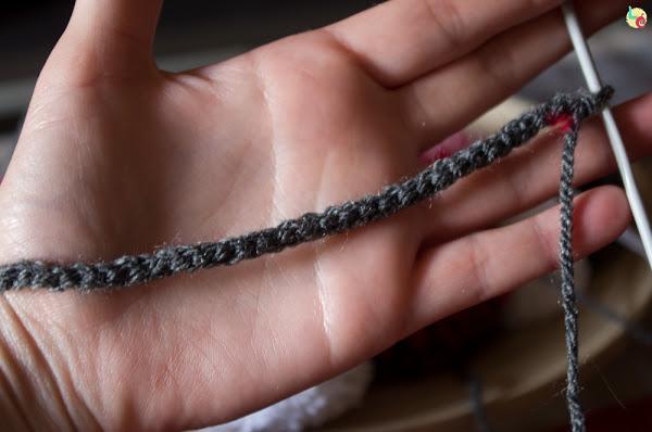 Ahora empezamos a pasar los pompones por la tira de esta manera; clavamos el ganchillo en el pompón, lo pasamos por la primera cadeneta de la tira y sacamos el ganchillo del pompón con la tira cogida.