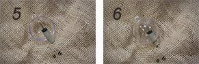 5/6- Ahora vamos a pasar las luces por adentro de la pelotilla y la tela, de tal forma que al cerrar los ojitos queden en su lugar, como vemos en las imágenes. |