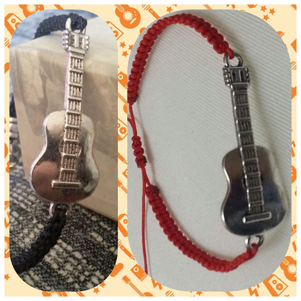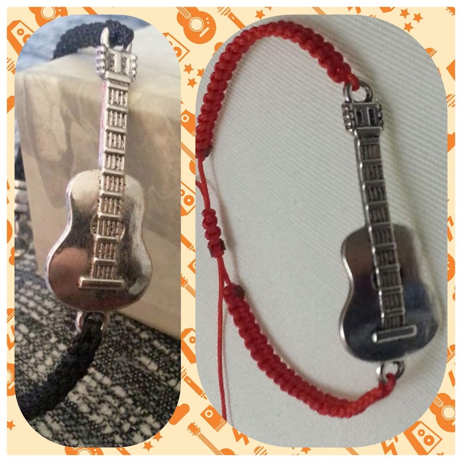 Aquí he usado un cordón encerado y como no una guitarra. Una de ellas la hice en nudo plano y la otra con el kumihimo, una con cierre corredizo y otra con cierre mosquetón.