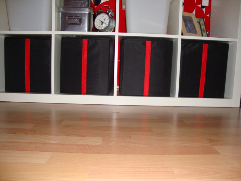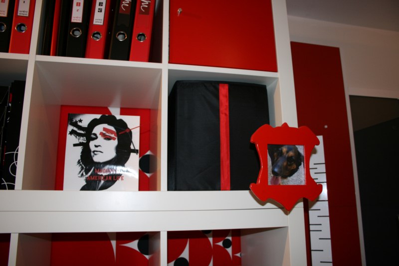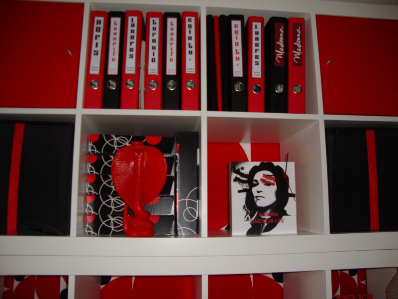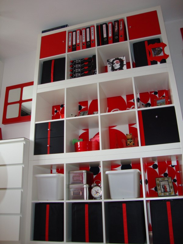 A juego con la habitación, he comprado clasificadores negros y rojos que hacen la función de álbumes de fotos.