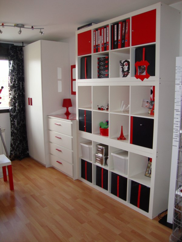 En un lateral de la habitación puse un armario y una cómoda de ikea. Ambos con tiradores rojos a juego.