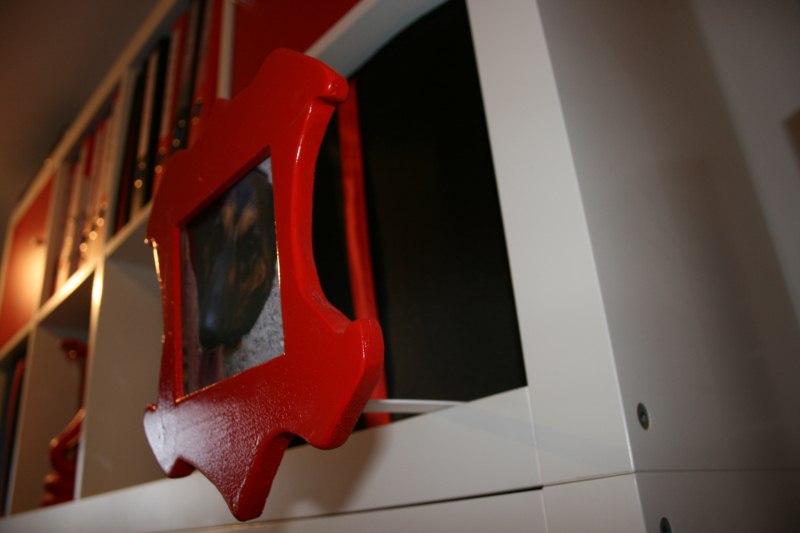 Con un espejo Malm de ikea, una caladora y pintura en spray he fabricado este marco de fotos que si se ve de frente parece estar suspendido en el aire, ya que sobresale de la estantería.