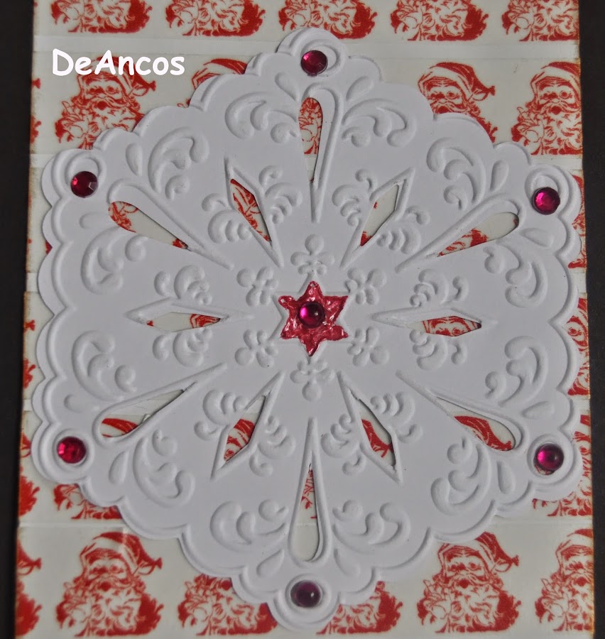 El fondo de la tarjeta está hecha con cinta washi de Papá Noel y encima he colocado un gran copo de nieve troquelado y embosado, decorado con brillantitos y liquid pearl.