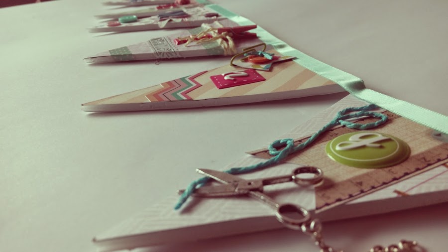 Nunca había visto de cerca nada realizado con la técnica del scrap y he de decir que me ha impresionado y si se unen piezas, texturas, elementos diferentes con tanto buen gusto se consiguen chuladas como este banderín!!