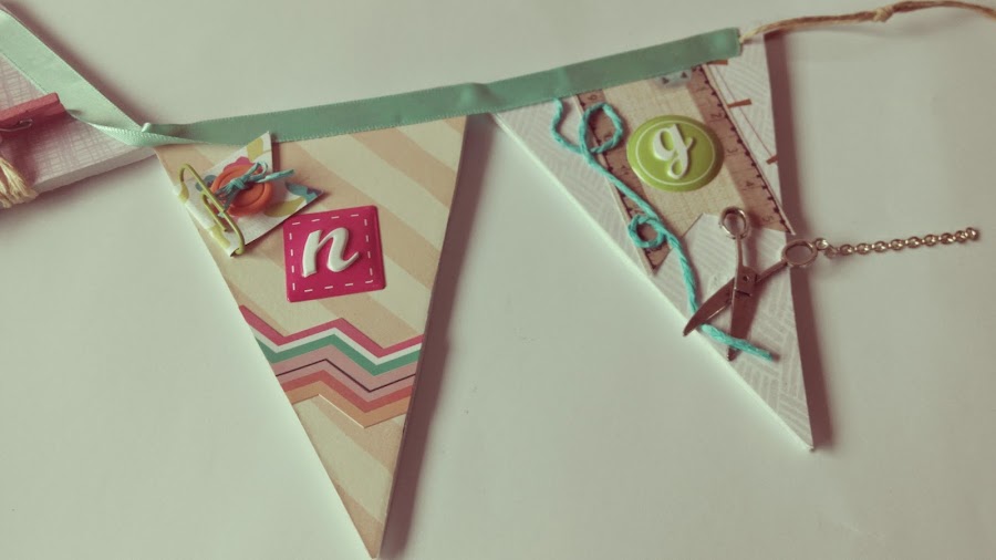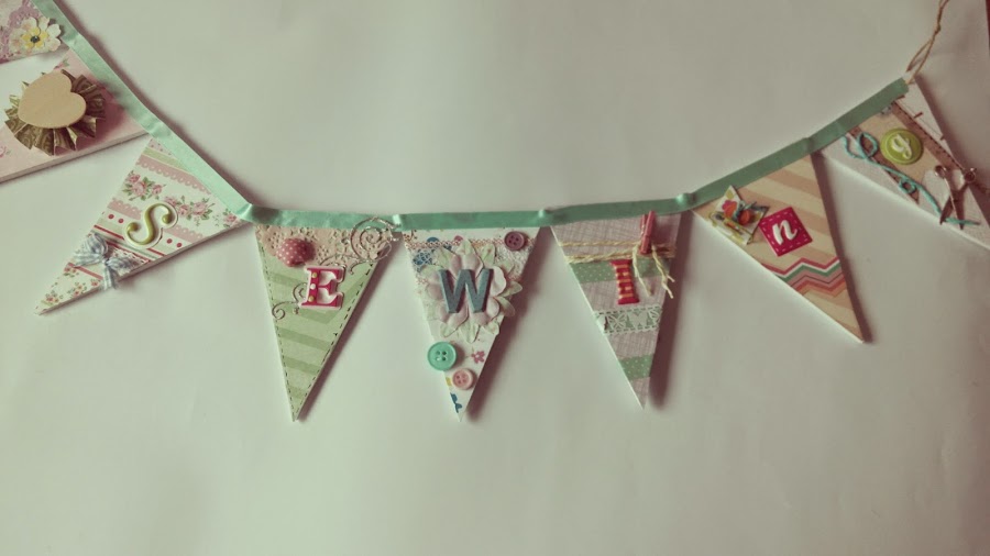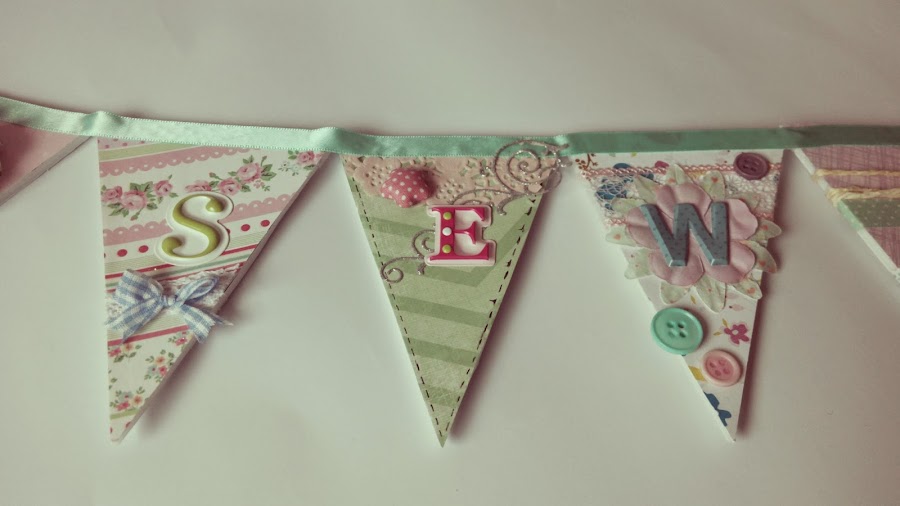 Un banderín en tonos pastel donde se lee la frase I love sewing. Realizado por Marta del blog Mis siete palabras donde ilustra de maravilla la técnica del scrapbooking y hace preciosidades como esta!!
