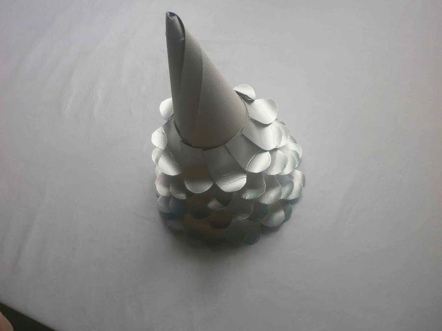 Con la ayuda del lápiz se hace una pequeña doblez a las piezas y a continuación se va pegando alrededor del cono de cartón.